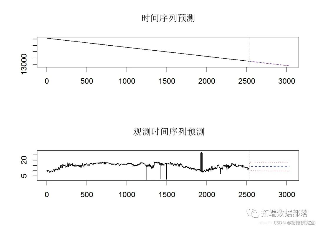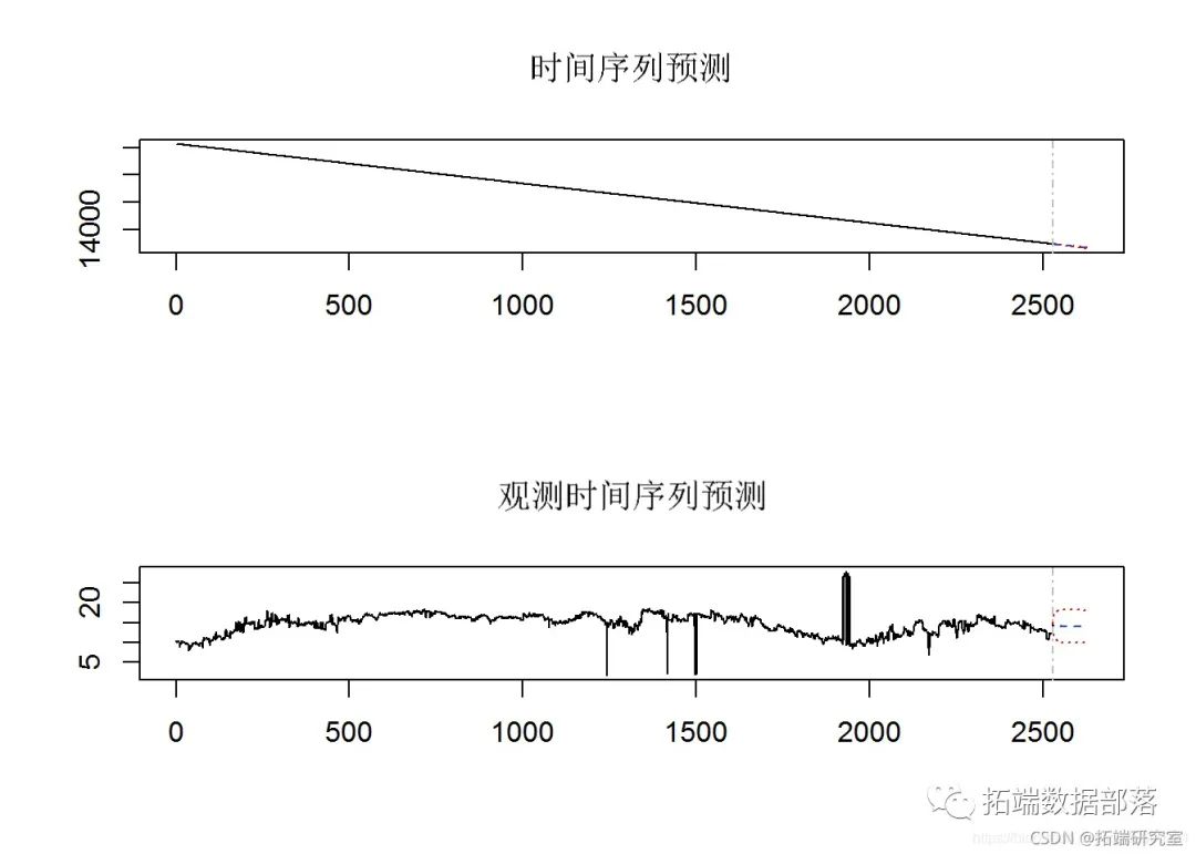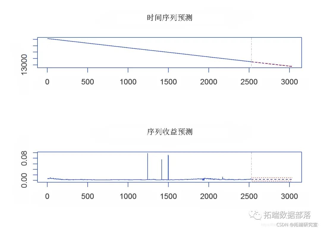 为了开始估算数据所隐含的未来事件,我们进行了初步的风险值估算。首先,所有行的平均值和日期信息的数据框架被转换为时间序列格式,然后从这个时间序列中计算出风险值。根据VaR计算对未来100天和500天的价值进行预测。在随后的预测图中,蓝色圆圈代表未来100天的数值,红色圆圈代表500天的回报值。