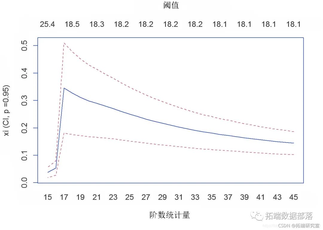 由于假设10股指数数据为重尾分布,数据极少变化,所以采用Hill Estimation对尾指数进行参数估计。目的是验证 10 只股票数据是否为极值分布。Hill Estimation 生成的图证实了。