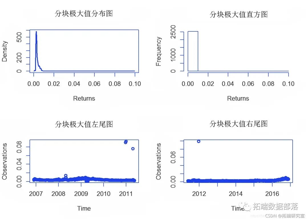 极值理论中的 Block Maxima 方法是 EVT 分析的最基本方法。Block Maxima 包括将观察期划分为相同大小的不重叠的时期,并将注意力限制在每个时期的最大观察值上。创建的观察遵循吸引条件的域,近似于极值分布。然后将极值分布的参数统计方法应用于这些观察。