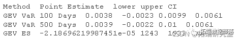 最后,给出了对 10 股指数 GEV 未来价值的估计结果表。3 个 GEV VaR 估计值(和 GEV 期望损失)的点估计值和范围制成表格比较。