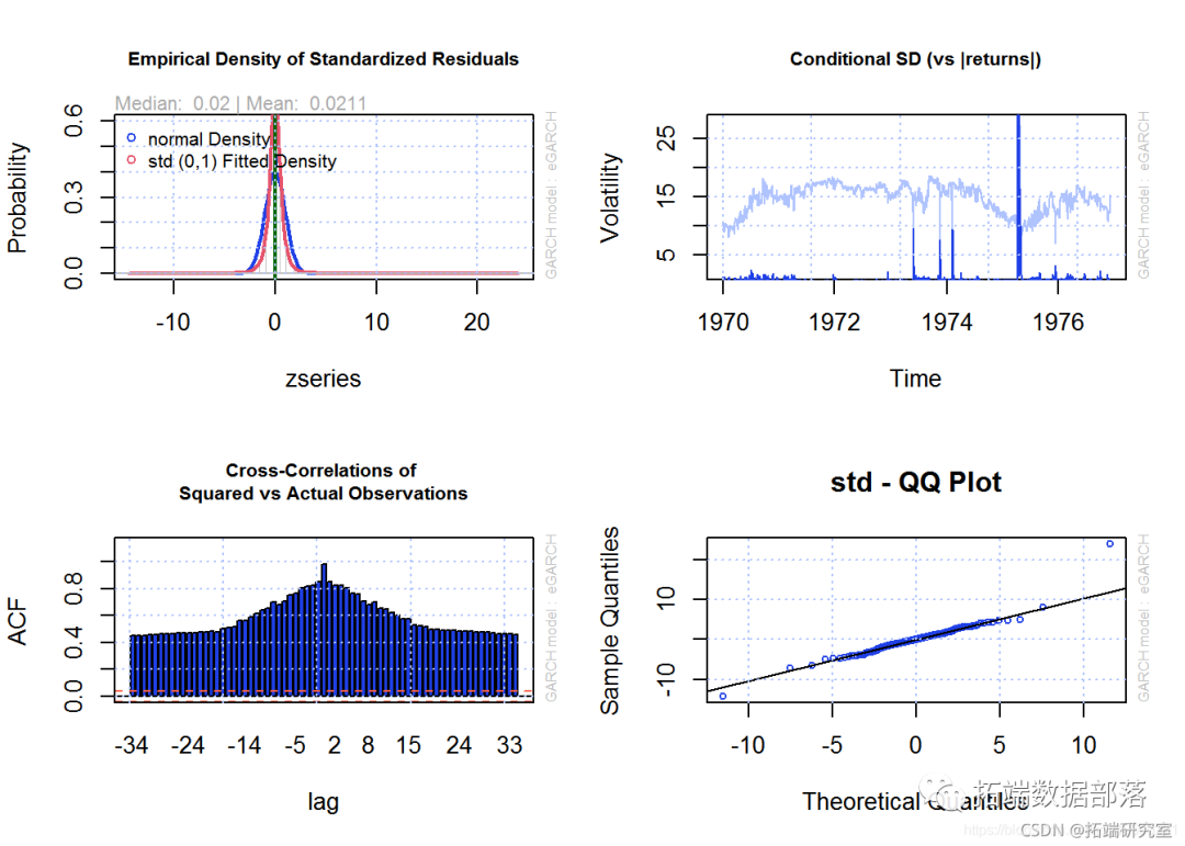 通过将 MLE(10 只股票指数的最大似然估计)拟合到 GARCH(1,1)(广义自回归条件异型性)模型,对峰值超过阈值 EVT 数据进行预测。显示预测公式参数表。创建了一个“自相关函数”(ACF)图,显示了随时间变化的重要事件。然后,显示拟合模型结果的一组图。然后创建对接下来 20 天(股票指数表现)的预测。最后,20 天的预测(来自峰值超过阈值 EVT extimation)显示在 2 个图中。