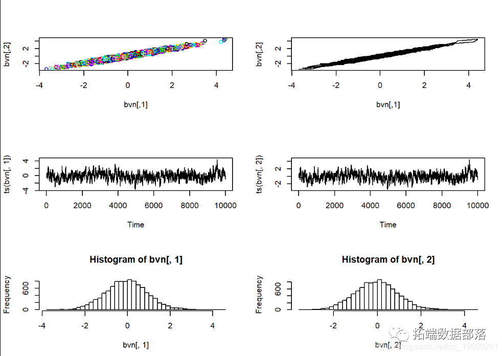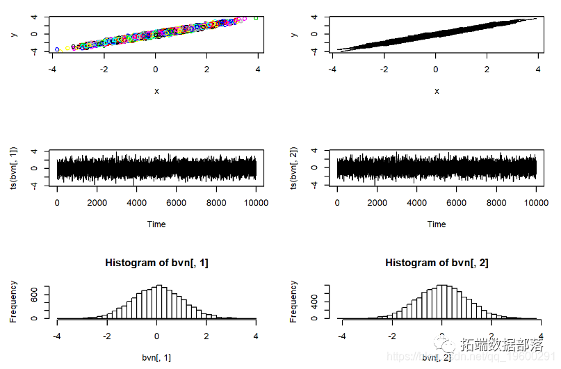 请记住,MCMC采样器只是随机数生成器的一种。我们可以使用Metropolis-Hastings采样器来开发自己的随机数生成器,生成进行简单的已知分布。在此示例中,我们使用MH采样器从标准双变量正态概率分布生成随机数。