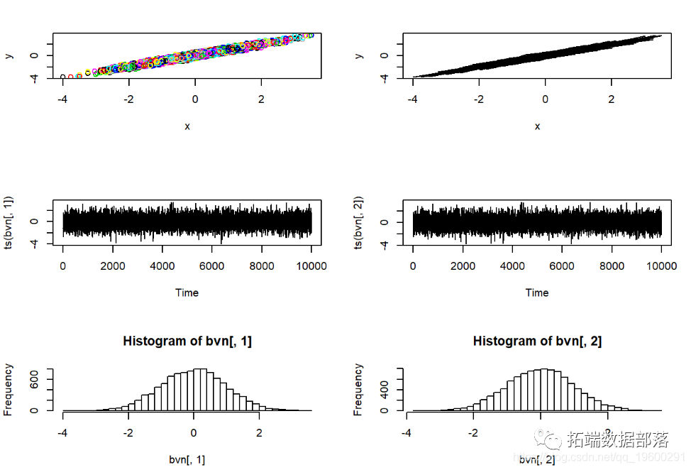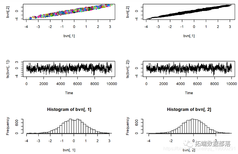 rbvn<-function (n, rho) #用于从二元标准正态分布中提取任意数量的独立样本。