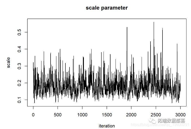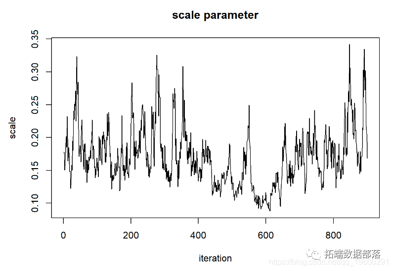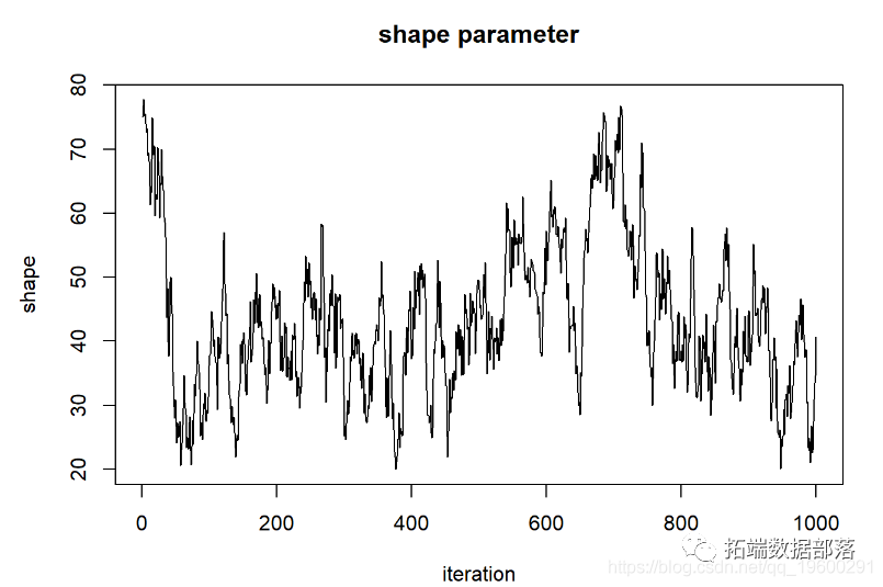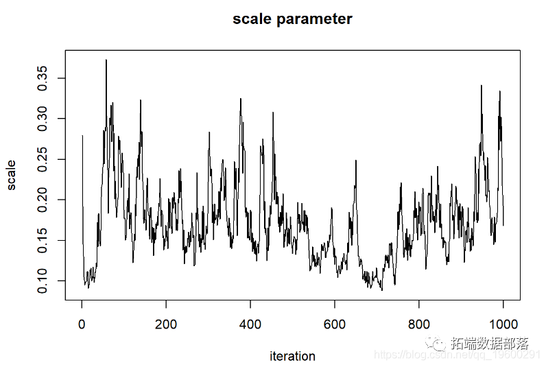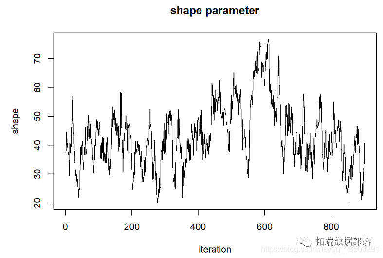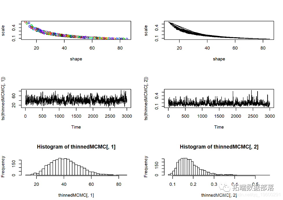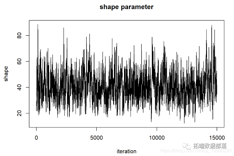 在许多情况下,我们没有足够的计算能力评估空间中所有n维像素的后验概率 。在这些情况下,我们倾向于利用称为Markov-Chain Monte Carlo 算法的程序 。此方法使用参数空间中的随机跳跃来(最终)确定后验分布(点击文末“阅读原文”获取完整代码数据)。
