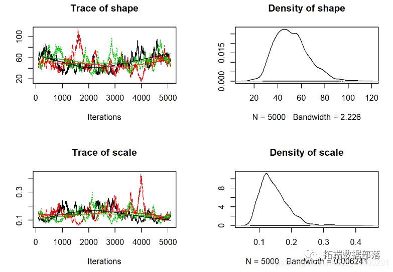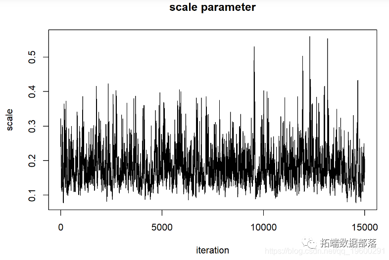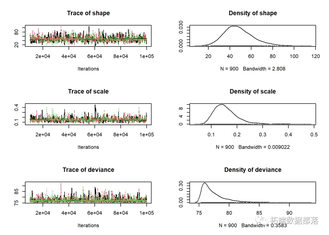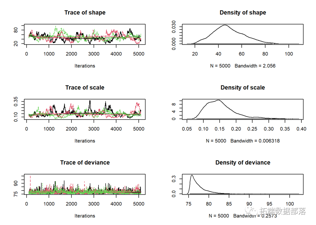 当视为“轨迹图”时,每个参数的链应看起来像白噪声(模糊的毛毛虫)或类似的噪声