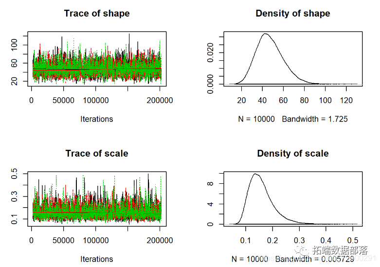 jags.fit) # 转换为“ MCMC”对象(CODA包)