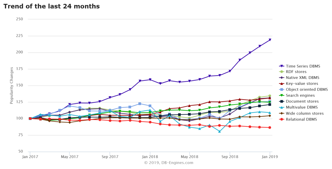 截止到当前(2019年1月),在过去的 24 个月中,专门处理时间序列数据的数据库已经成为增长最快的类别:
