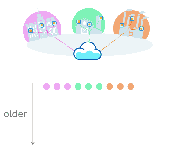 以下是一个基础示例,设想一些传感器从三个环境中收集数据:分别是城市、农场和工厂。在这里,每一个数据源定期发送新的读数,创建一系列随时间推移收集到的测量结果。