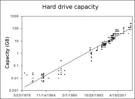 根据摩尔定律,计算能力(晶体管密度)每18个月翻一番,而克拉底定律则假定存储容量每12个月翻一番。