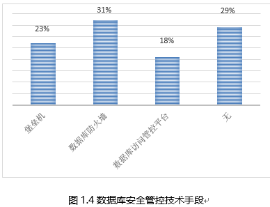 有超半数单位没有使用专业的数据库安全管控产品,近一半单位不能满足数据库管理制度的要求。可见,对技术手段的认知有待提高。目前所采取的数据库安全管控技术手段中,数据库防火墙最受青睐。调查显示,49%的参与者已部署数据库防火墙或数据库访问管控平台,23%只部署了堡垒机,29%未采取任何技术手段。