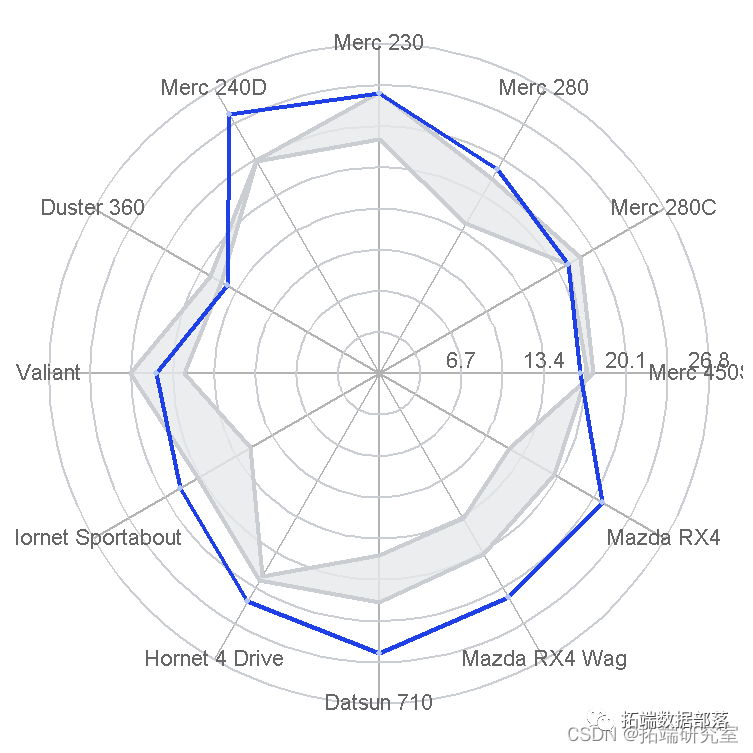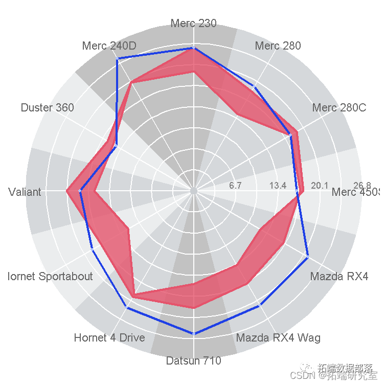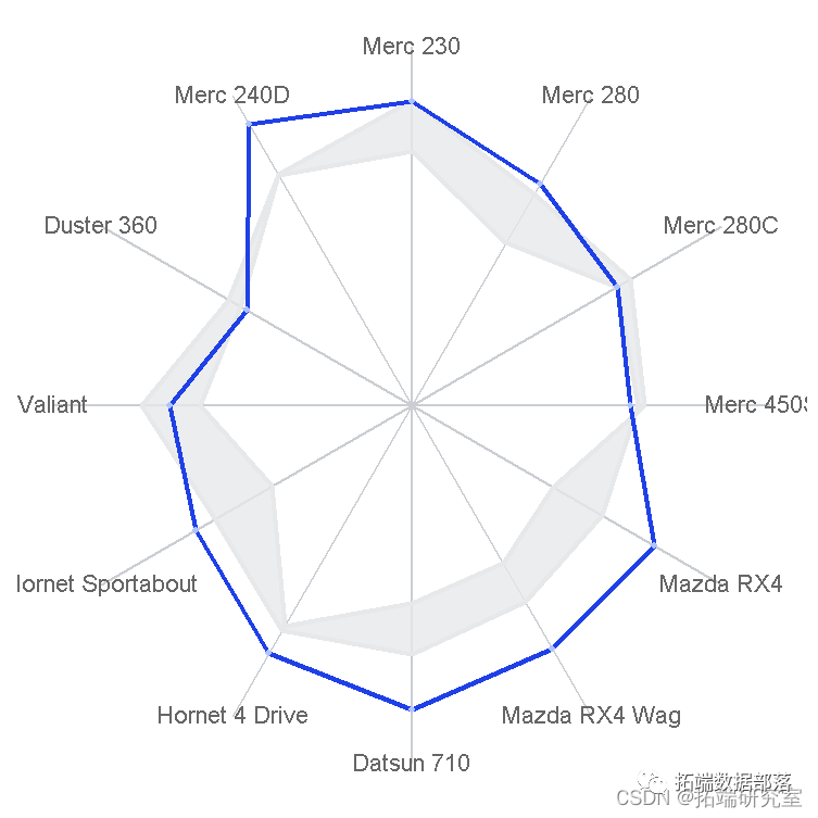 本文摘选《R语言GGPLOT2绘制圆环图雷达图/星形图/极坐标图/径向图POLAR CHART可视化分析汽车性能数据》,点击“阅读原文”获取全文完整资料。
