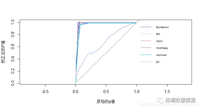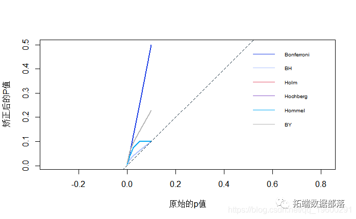调整后的p值与原始p值在0到0.1之间的一系列5个p值的绘图。请注意,Holm和Hochberg的值与Hommel相同,因此被Hommel隐藏。虚线表示一对一的线。