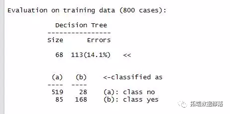 在决策树生成后,输出一个混淆矩阵,这是一个交叉列表,表示模型对训练数据错误分类的记录数: