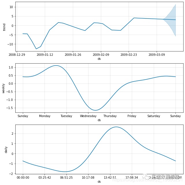 我们还可以绘制预测中不同成分的细分。预测的不确定性区间是由外推趋势的MAP估计值决定的。
