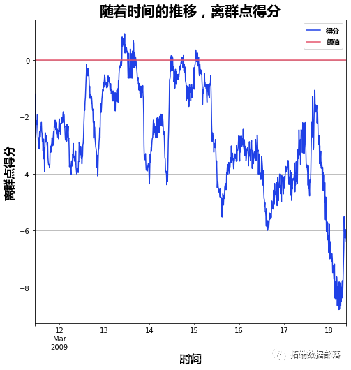 该模型预测还包括一个围绕估计的趋势部分的不确定性区间。另外,完全的贝叶斯推断也可以以增加计算量为代价。然后,不确定性区间的上限和下限值可以作为每个时间点的离群点阈值。首先,计算从观测值到最近的不确定度边界(上限或下限)的距离。如果观察值在边界内,离群点得分等于负距离。因此,当观测值与模型预测值相等时,离群点得分最低。如果观察值在边界之外,得分等于距离测量,观察值被标记为离群点。然而,该方法的一个主要缺点是,当新的数据进来时,你需要重新调整模型。这对于具有实时检测的应用来说是不可取的。