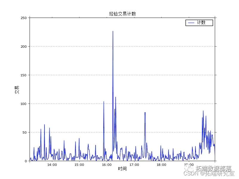出于演示目的,我使用的数据是 2013 年 4 月 20 日 13:10 到 19:57 之间的 5000 笔交易。这是 1 分钟窗口内聚合的交易计数图。