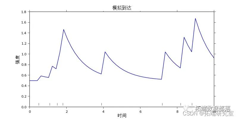 自我激发性在时间标记 2 之前的前四个事件中是可见的。它们在彼此相距很短的时间内发生,这导致第四个事件的强度峰值很大。每一次事件的发生都会增加另一次发生的机会,从而导致事件的聚集。第五个数据点仅在时间标记 4 处到达,与此同时,导致整体强度呈指数下降。