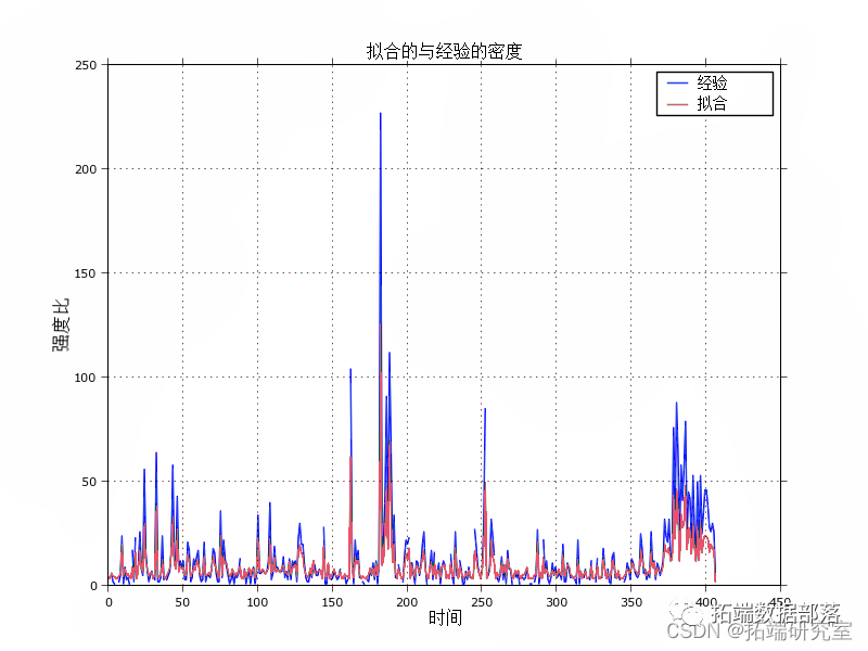 下图比较经验计数(来自本文的第一个图)和拟合的综合强度。
