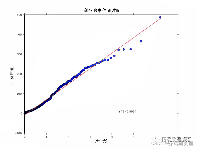 检验模型与数据拟合程度的另一种方法是评估残差。理论上说[4],如果模型拟合得好,那么残差过程应该是同质的,应该有事件间时间(两个残差事件时间戳之间的差值),这些时间是指数分布。事件间时间的对数图,或者在我们的案例中,对指数分布的QQ图,证实了这点。下面的图显示了一个很好的R2拟合。