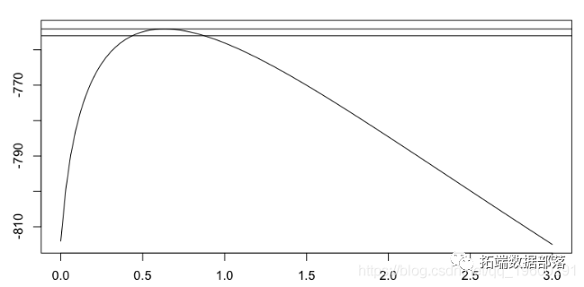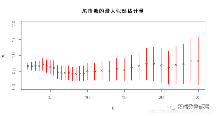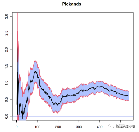 因此,可以绘制尾指数的最大似然估计量,作为阈值的函数(包括置信区间),