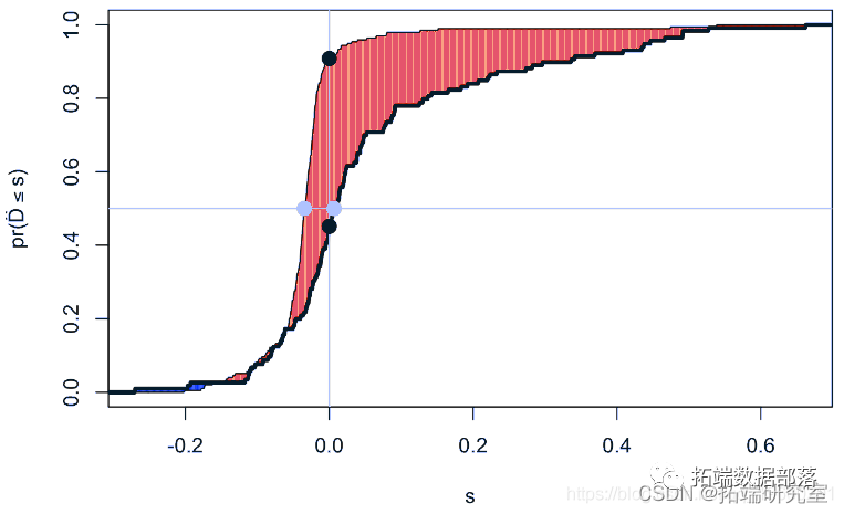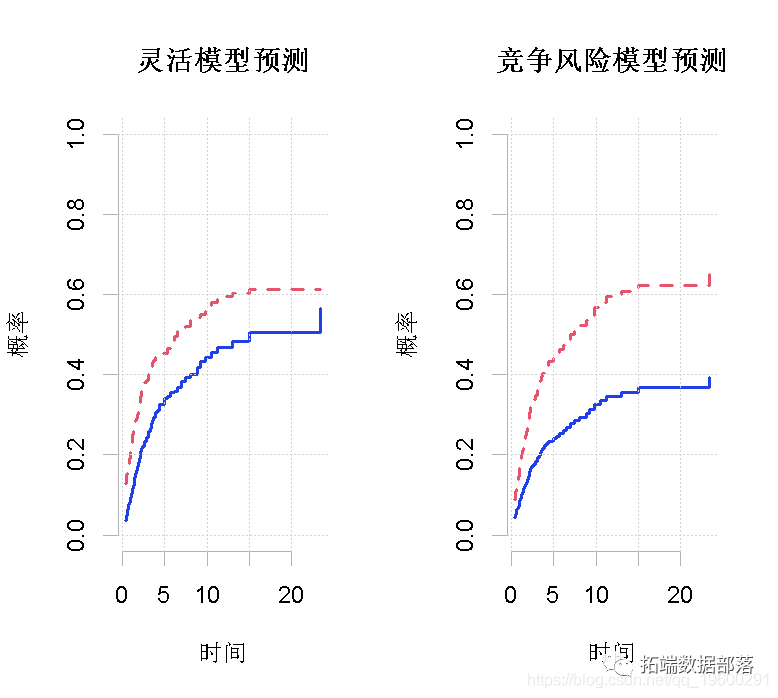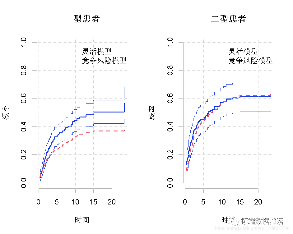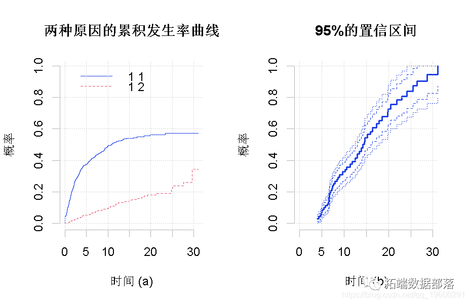 图1(a)显示了估计的两种原因的累积发生率曲线。在图1(b)中,我们构建95%的置信区间(虚线)和95%的置信带。