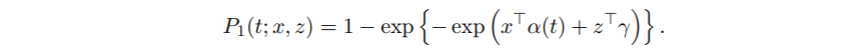 我们首先拟合一个一般比例模型,允许所有协变量具有时变效应。在下面的调用中,只有模型(6)中的协变量x被定义。模型(6)中的协变量z是由一个const操作符指定的。