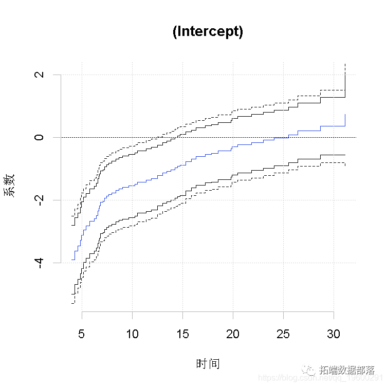 我们指定事件时间并删减变量为cause == 0。回归模型只包含一个截距项(+1)。cause变量给出了与不同事件相关的原因。cause= 1指定我们考虑类型1的事件。计算/基于估计值的时间可以由参数times = times1给出。