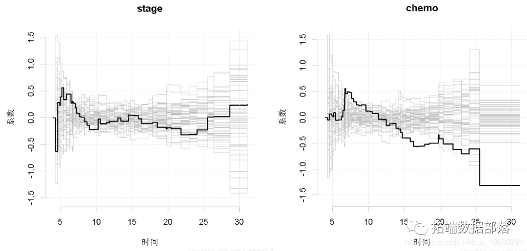 基于非参数检验的显著性检验显示,在非参数模型中,阶段和年龄是显著的,化疗是较显著的(p = 0.056),血红蛋白是不显著的(p = 0.889)。