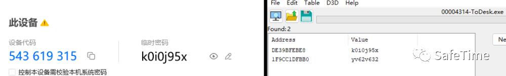 用Cheat Engine对ToDesk.exe的内存进行搜索,找到密码字段,一共有两个位置