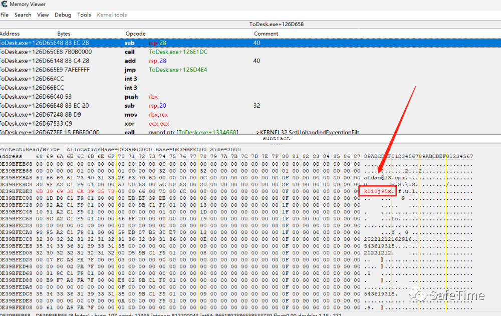 再更新一次密码,查看两个地址位的变化,DE39BFEBE8的值随着ToDesk密码的变化发生了变化,而1F9CC1DFBB0没有改变,所以以DE39BFEBE8地址位作为突破口