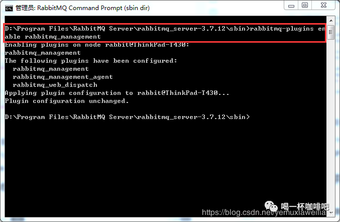 安装的 RabbitMQ Server\rabbitmq_server-3.7.12\sbin 目录下面 执行一条cmd命令:rabbitmq-plugins enable rabbitmq_management