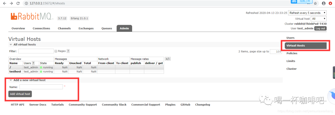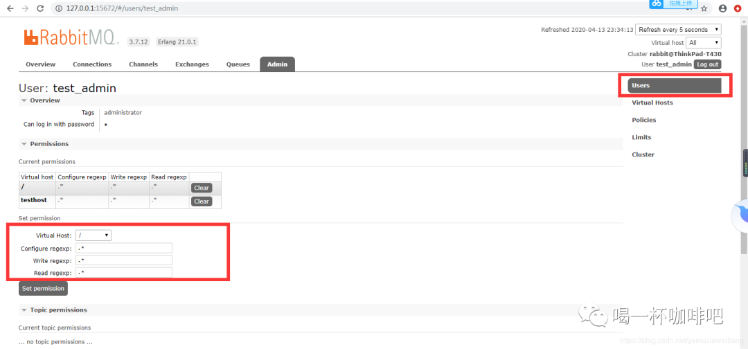 给用户设置Virtual host的权限,正则匹配都是* 也就是所有权限