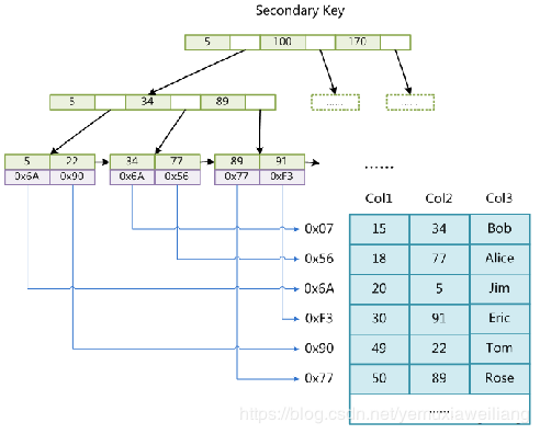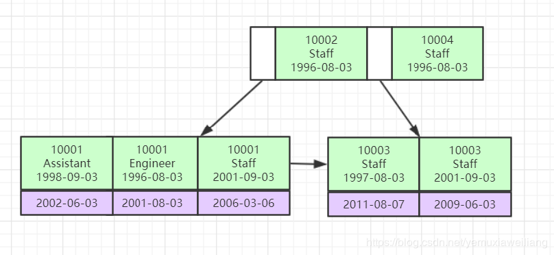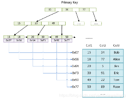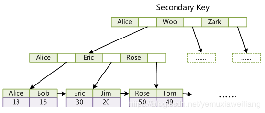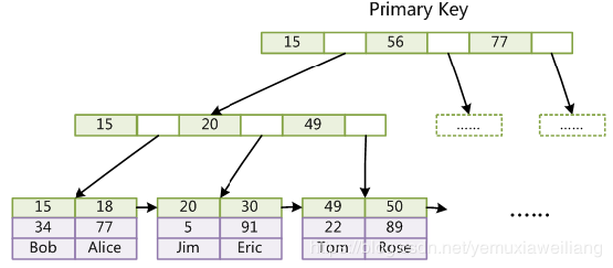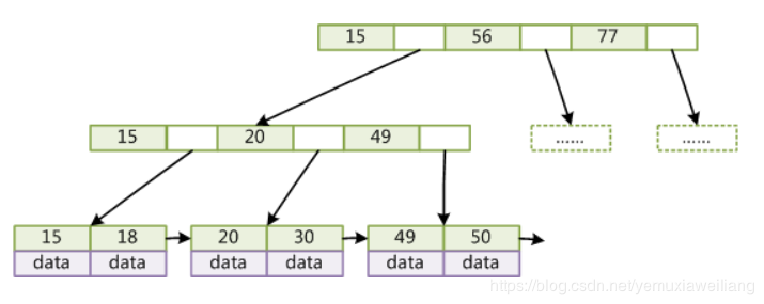 继承了B树的特点,并在其基础上进一步优化,非叶子节点只存储key,叶子节点存储所有的数据,并使用指针相连。