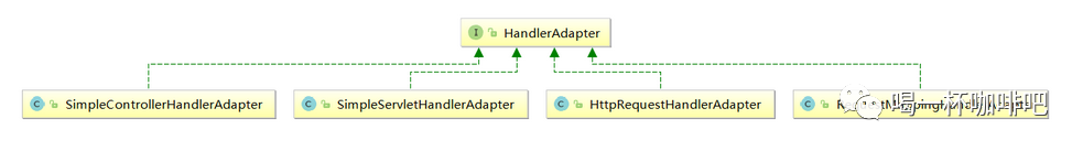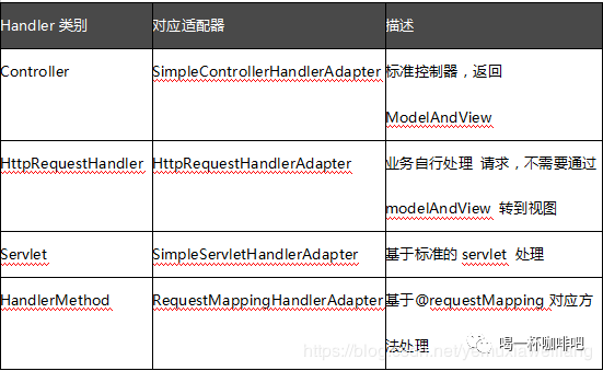 这里spring mvc 采用适配器模式来适配调用指定Handler,根据Handler的不同种类采用不同的Adapter,其Handler与 HandlerAdapter 对应关系如下:
