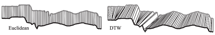 左边是欧氏距离的对应关系,在同一时刻上的点相互对应,计算总距离;右边是DTW的点对应关系,可以看到,下面序列某时刻的点可以对应上面序列非同一时刻的点,同时一个点可以对应多个点,多个点也可以对应一个点,也就是说每个点尽可能找离它距离最小的点,允许时间轴上的伸缩。显而易见的,这种情况下 DTW 计算的距离比欧氏距离更小。因此对于时间上有拉伸或压缩的序列,使用 DTW 计算的序列距离更加合理,因此该算法在语音序列匹配中使用十分广泛。