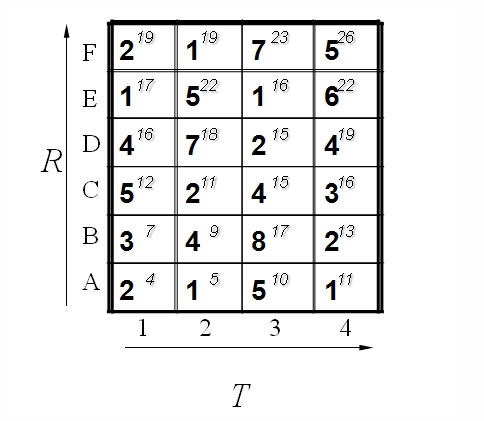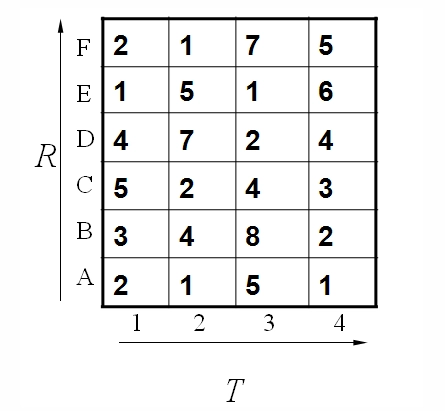 假设标准模板 R 为字母 ABCDEF (6个),测试模板 T 为 1234 (4个)。R 和 T 中各元素之间的距离已经给出。如下: