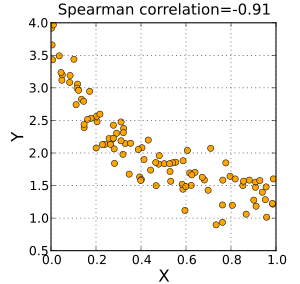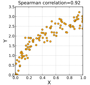 在统计学中,斯皮尔曼等级相关系数(英语:Spearman's rank correlation coefficient 或 Spearman's ), 经常以希腊字母 或以 表示,此相关系数以查尔斯·斯皮尔曼之名命名。它是衡量两个变量的依赖性的无母数指标。它利用单调方程评价两个统计变量的相关性。若数据中没有重复值,且当两变量完全单调相关时,斯皮尔曼相关系数为 +1 或 −1 。