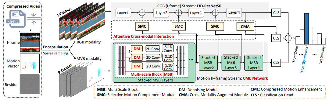 首先从压缩视频中解码出 帧和 帧,分别对应 RGB 和 MVR 两种模态信息。RGB 流被送入 I3D-ResNet50 骨干网络;MVR 流被送入堆叠 MSB 网络。