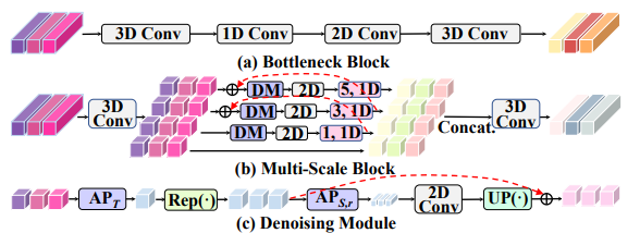 为了解决第一个问题,作者提出的 MSB 模块包括四个独立级联的分支,通过不同的内核大小(即1、3和5)捕获短期/长期动态,可以有效地提取多个空间粒度上的多尺度运动模式,而不会增加太多额外的计算成本;包含的 DM 模块利用门控机制在时间和空间上都抑制噪声。