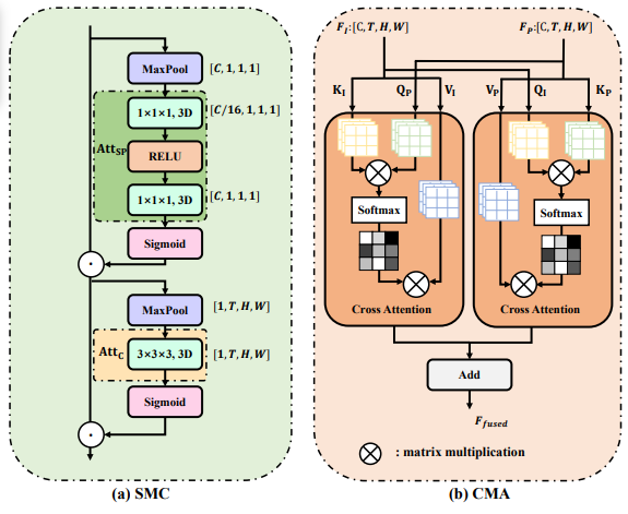 为了解决第二个问题,作者分别提出 SMC 和 CMA 用以加强两个模态之间的信息交流。SMC 通过整合来自 MVR 模态的信息运动线索,增强了 RGB 模态的表征学习。通过交叉注意聚合多模态特征,CMA 进一步构建了一个跨模态表示,作为单模态表示的扩充。从两个独立的流中提取的高级特征与 CMA 学习到的特征在分数层面进行融合,最终进行预测。