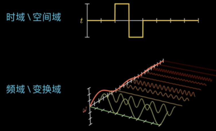 这个变换域其实就是频域,也就是从时域到频域相当于做了一个希尔伯特空间的坐标转换。频域里的变换就是这个代表特征值的定积分。 代表向量 在新坐标轴 下的坐标值。 与该坐标轴的单位向量 相乘即表示其在该坐标轴上的分量。把在各坐标轴上的分量相加即可得到向量 ,这就是希尔伯特空间的坐标转换的逆过程:
