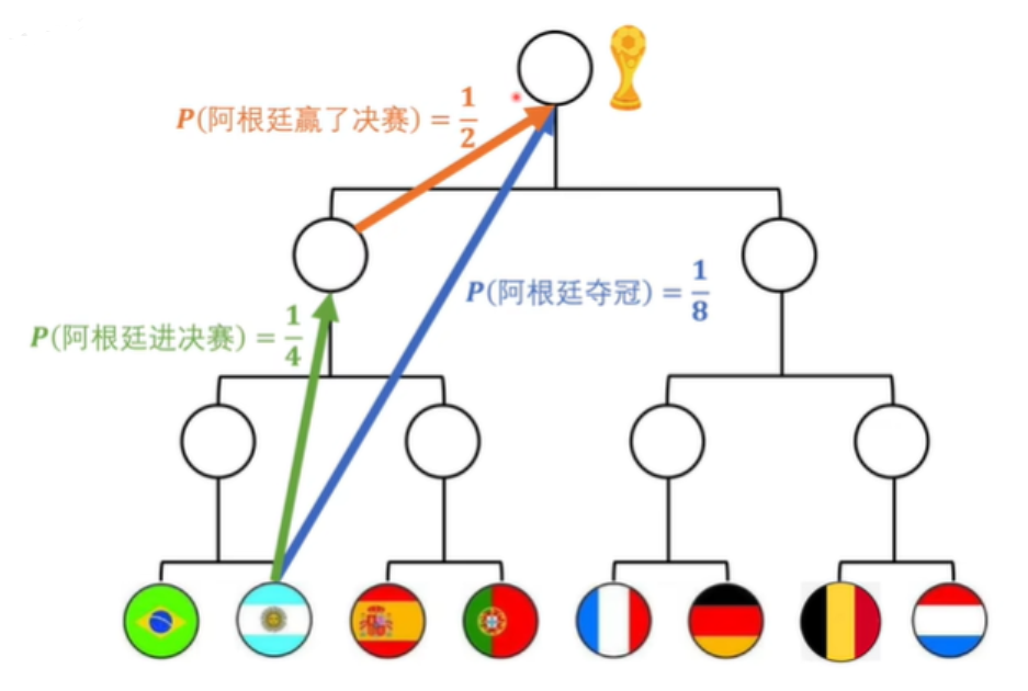 再如,阿根廷夺冠的信息量是等于阿根廷进决赛和进决赛之后阿根廷赢了比赛信息量是相等的,同时这也是概率事件,所以得出: