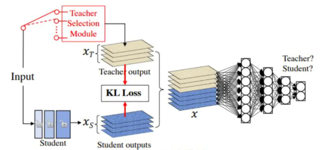 就是 KL 散度,因为蒸馏模型的目标分布也是一个模型,该模型针对同类别的不同样本,会给出不同的预测值(如两张猫的图片 a 和 b,目标模型对 a 预测为猫的值是 0.6,对 b 预测为猫的值是 0.8)。