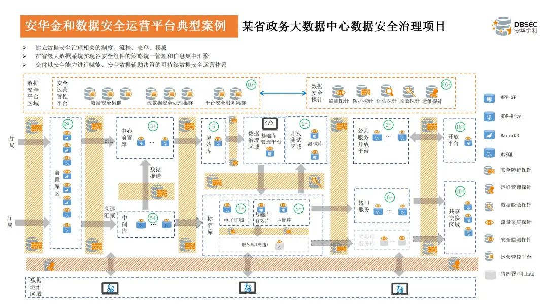 通过建设数据安全监测能力、安全防护能力、安全运维能力、安全加密能力、安全溯源能力、安全脱敏能力,形成完整的数据安全防护能力框架。整个数据安全的防护从数据汇聚开始,到数据的共享开放为止,涵盖了数据收集、数据加工、数据运维、数据测试、数据开放等多个环节。