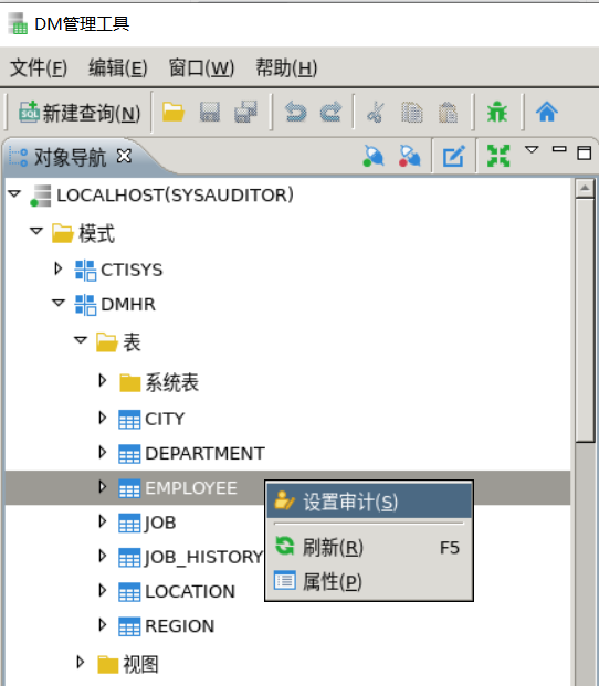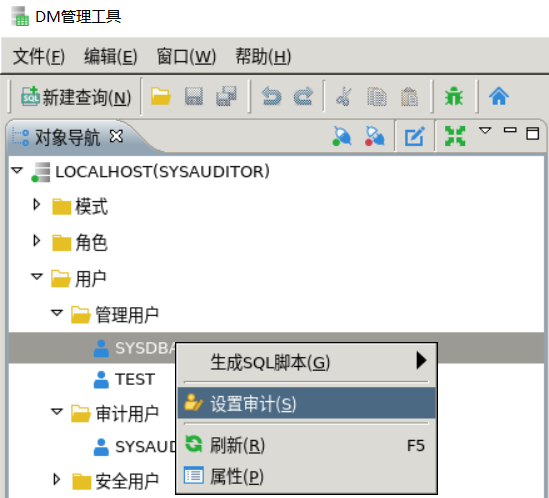 [dmdba@localhost ~]$ cd dm8/bin[dmdba@localhost bin]$ ./disql sysauditor/Dameng123SQL> SP_SET_ENABLE_AUDIT(1);