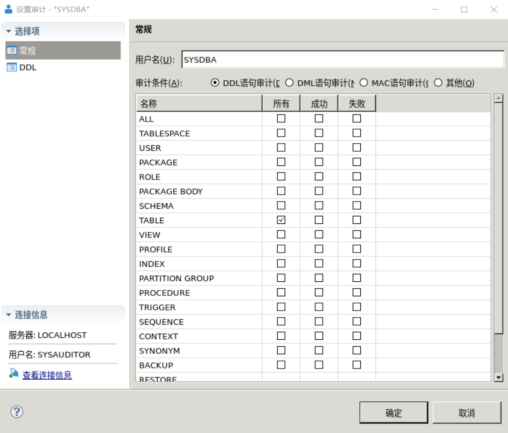 例1:审计SYSDBA用户对表的创建、修改和删除