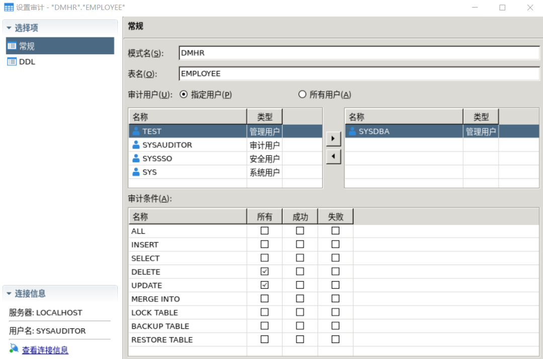SQL> SP_AUDIT_OBJECT('DELETE', 'SYSDBA', 'DMHR', 'EMPLOYEE', 'ALL');SQL> SP_AUDIT_OBJECT('UPDATE', 'SYSDBA', 'DMHR', 'EMPLOYEE', 'ALL');