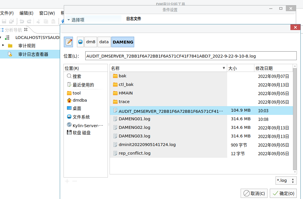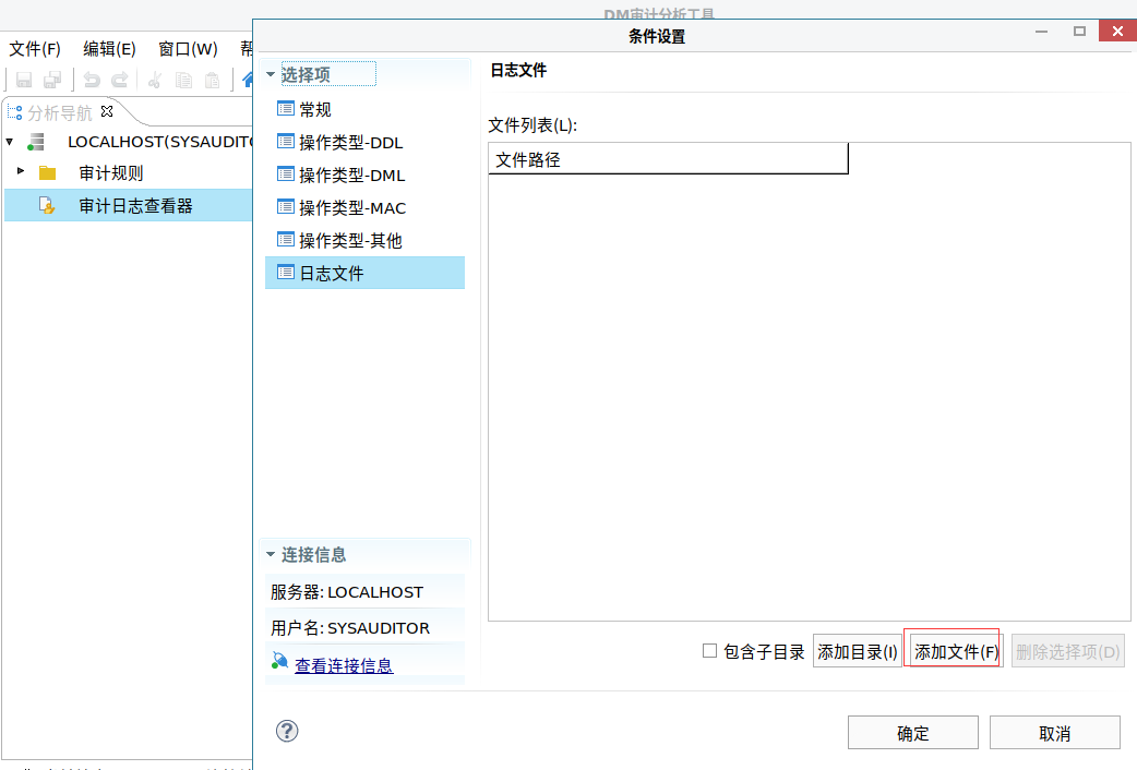 双击审计日志查看器,选中日志文件,点击添加文件。