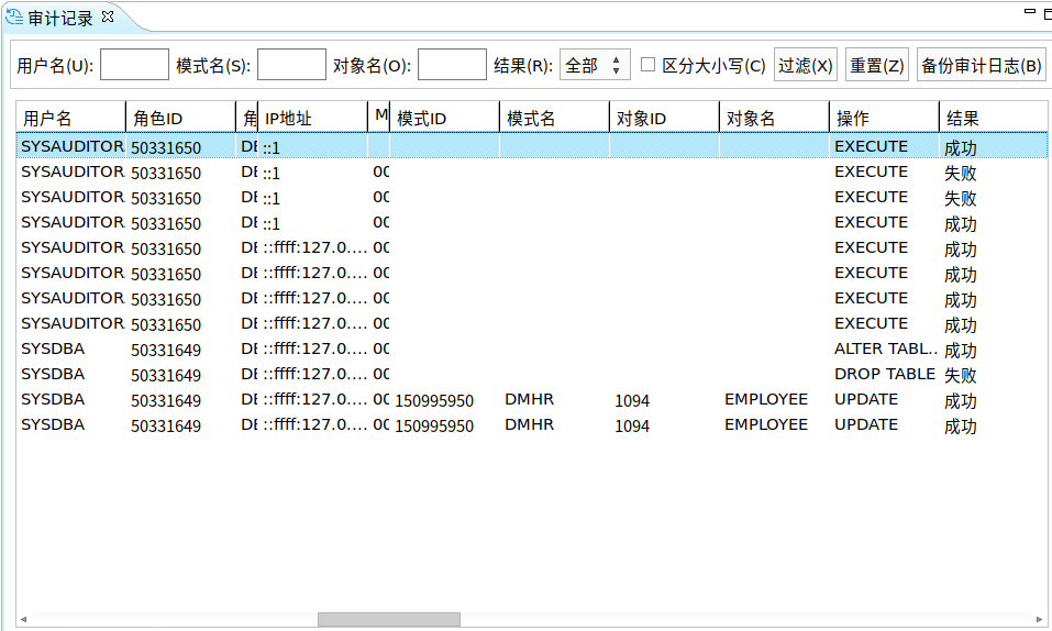 通过查询动态视图V$AUDITRECORDS的结果集查看审计记录,可以查看到和审计分析工具一样的结果。