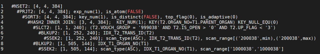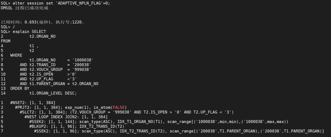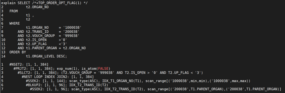 SELECT /*+TOP_ORDER_OPT_FLAG(1) */t2.ORGAN_NOFROMt1 ,t2WHEREt1.ORGAN_NO = '1000038'AND t2.TRANS_ID = '200038'AND t2.VOUCH_GROUP = '999038'AND t2.IS_OPEN >'0'AND t2.UP_FLAG <'3'AND t1.PARENT_ORGAN = t2.ORGAN_NOORDER BYt1.ORGAN_LEVEL DESC;